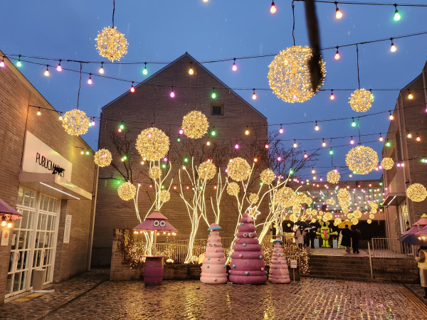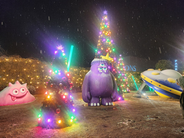 13일 오후에 찾은 경기도 이천 '시몬스 테라스'. 이 곳 중앙광장에선 최대 8미터 높이의 메인 크리스마스 트리를 포함해 크고 작은 6개의 트리가 화려한 오색 빛을 발했다. 트리 옆 곳곳엔 우스꽝스러운 몬스터 캐릭터들과 UFO조형물이 함께 설치돼 마치 광장을 점령한 듯한 세계관을 연출한다. 발걸음을 옮겨 중정으로 들어서면 퍼플, 핑크 트리로 변신한 몬스터들과 화려한 파티 분위기를 연출하는 조명들이 더해져 보는 이들을 연말 감성으로 물들인다.