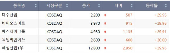 한국거래소에 따르면 15일 유가증권시장에서는 금호건설우(29.76%)과 동양고속(29.89%), 코스닥시장은 대주산업(29.95%), 바이오스마트(29.95%), 에스제이그룹(29.91%), 육일씨엔에쓰(30.00%), 해성산업1우(29.95%) 5개 종목이 상한가를 기록했다.
