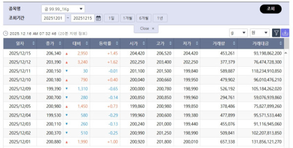 국내 금시세는 이달 들어 20만 원 전후 구간에서 박스권 흐름을 이어가고 있다. 거래량은 일별로 등락을 반복하는 가운데 가격은 급등보다는 완만한 상승과 조정이 반복되는 모습이다. 이는 환율 변동성과 국제 금값 흐름, 연말 투자 심리가 동시에 반영된 결과로 풀이된다.