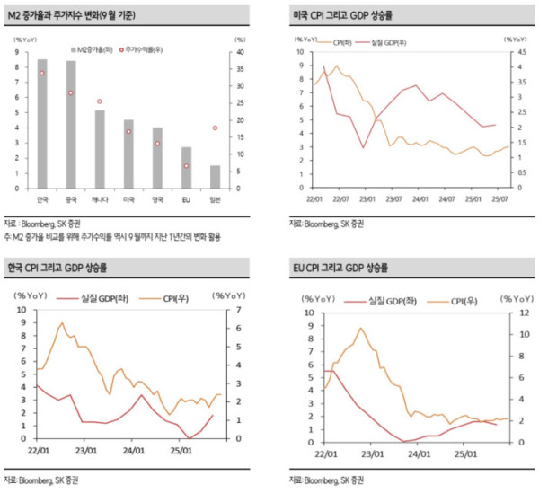 강 연구원은 “유동성 공급이 실질 GDP 성장률을 끌어올리거나 물가를 자극하는 효과로 이어지지 않았다”며 “한국은 2024년을 기점으로 M2 증가율이 본격 반등했지만 소비자물가지수(CPI) 증가율과 GDP 성장률은 오히려 하락했고, 이런 흐름은 미국과 EU 데이터에서도 확인된다”고 설명했다.
