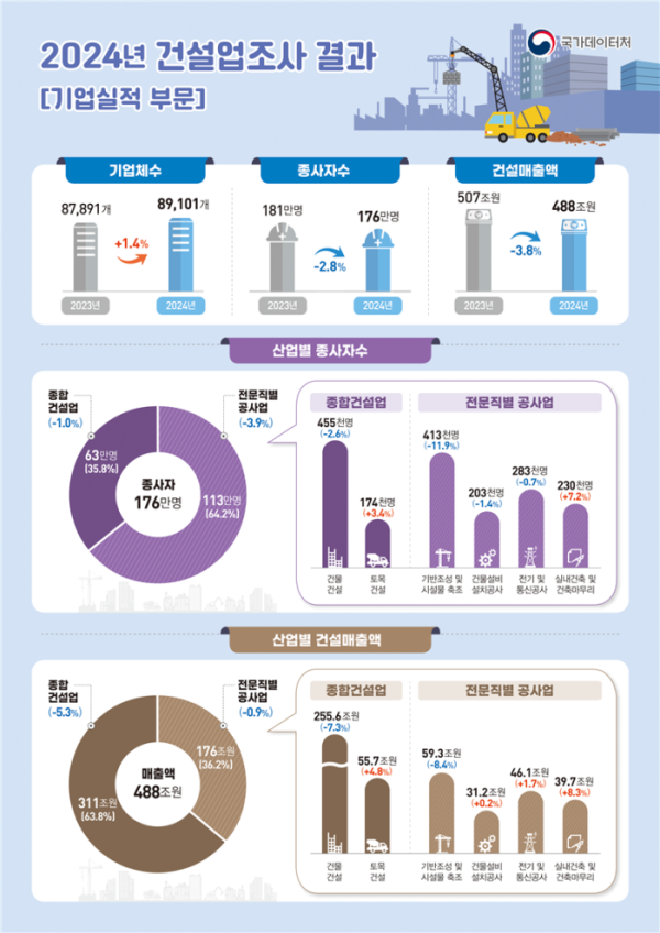 부문별로 보면 종합건설업 매출은 311조4000억 원으로 5.3% 줄어 감소 폭이 컸다. 특히 건물건설업 매출이 7.3% 감소하며 전체 실적 하락을 이끌었다. 전문직별 공사업 매출도 176조3000억 원으로 0.9% 감소했다.