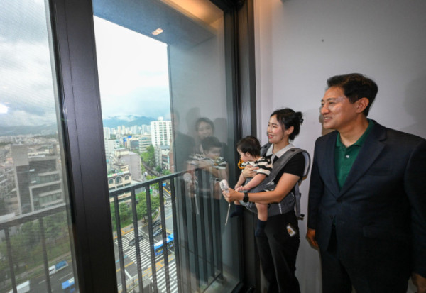 ▲오세훈 서울시장이 지난 8월 서울 송파구 '비아파트형 미리내집' 르피에드 주거용오피스텔을 방문해 서울 베이비 엠버서더와 주택 내부를 둘러보고 있다. (뉴시스)