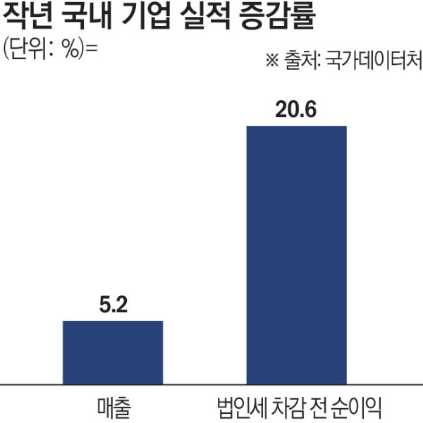 국내 기업의 세전 순이익은 2021년 125조 원 늘며 깜짝 반등하다가 2022년 마이너스로 전환한 뒤 2023년까지 2년 연속 감소 흐름을 이어갔다. 지난해에는 다시 증가 전환했다. 통계작성 이래 순이익이 가장 큰 해는 2021년(222조 원)과 2022년(197조 원)으로, 코로나 팬데믹 기저효과가 영향을 끼쳤다.