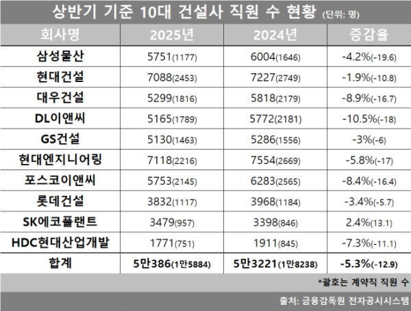 전년 동기 대비 올해 상반기 건설업체 직원 수는 △삼성물산 6004명→5751명 △현대건설 7231명→7088명 △현대엔지니어링 7554명→7118명 △대우건설 5286명→5130명 △DL이앤씨 5772명→5161명 △GS건설 5818명→5299명 △포스코이앤씨 6283명→5753명 △롯데건설 3968명→3832명 △HDC현대산업개발 1911명→1771명으로 줄었다. 반면 SK에코플랜트는 3398명에서 3479명으로 증가했다.