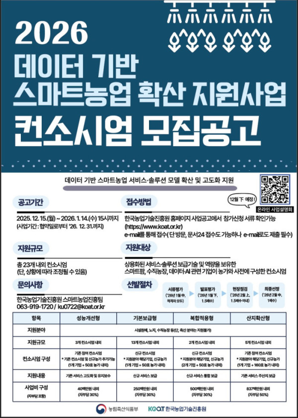 한국농업기술진흥원은 농림축산식품부와 함께 내년 1월 14일까지 ‘2026년 데이터 기반 스마트농업 확산 지원사업’의 사업 대상자를 모집한다고 16일 밝혔다.