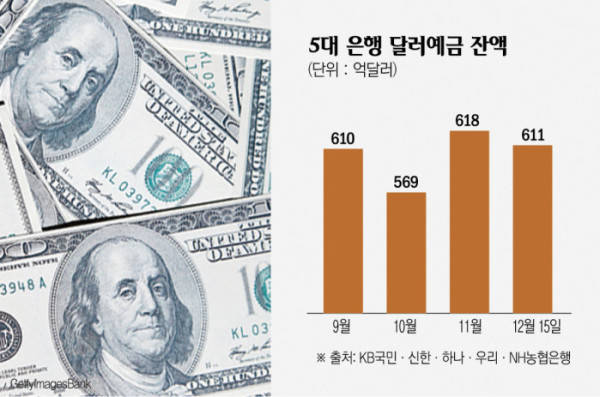 16일 금융권에 따르면 5대 은행(KB국민·신한·하나·우리·NH농협)의 달러예금 잔액은 이달 15일 기준 611억 달러로 집계됐다. 이는 11월 말 기준 618억 달러보다 다소 줄어든 수준이다. 다만 월말로 갈수록 잔액이 다시 불어날 가능성이 크다는 시각이 많다.