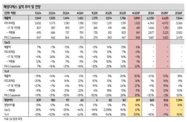 해성디에스는 반도체 기판 생산이 주 사업이다. 주로 범용 메모리(DDR4~DDR5)용 패키징 기판(PKG Substrate)과 IT용, 차량용 리드프레임을 공급한다. 권 연구원은 “매출 구성은 3분기 누적 기준 리드프레임 77%, 패키징 기판 23%”라며 “현재의 메모리 시장 호황과 2026년부터 시작될 전기차 시장 회복 및 단가 상승에 따른 리드프레임 실적 회복 동시 수혜가 예상되는 업체”라고 설명했다.