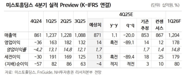4분기 실적은 시장 기대에 부합할 전망이다. 4분기 연결 매출은 전년 동기 대비 1% 증가한 8707억 원, 영업이익은 흑자 전환한 144억 원으로 추정했다. 미스토 부문은 비용 효율화와 라이선스 사업 효과로 이익 개선이 예상되며, 아쿠쉬네트는 비수기 영향으로 적자가 이어지지만 전년 대비 축소될 것으로 봤다.