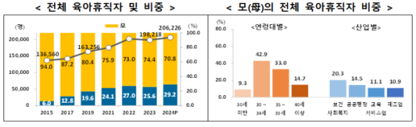 육아휴직자는 2018년(15만3741명) 15만 명을 돌파한 뒤 꾸준히 증가하며 2022년(20만2093명) 20만 명을 넘어섰다. 2023년(19만8218명) 10만 명대로 감소했지만 이듬해 플러스 전환에 성공하며 20만 명을 다시 돌파했다.