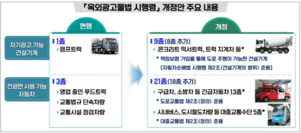 앞으로 레미콘·굴착기 등 도로 주행이 가능한 건설기계에도 옥외광고가 허용된다. 구급차 등 긴급자동차와 노선버스 등 대중교통수단에는 전광판 사용이 가능해진다.