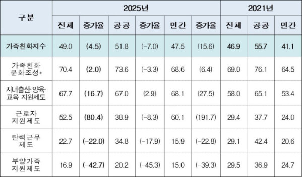17일 성평등가족부가 발표한 '2025년 기업 및 공공기관의 가족친화수준 조사'에 따르면, 올해 가족친화지수는 49점으로 2021년 대비 2.1점 상승했다. 지수 추이는 △2015년 36.1점 △2018년 40.6점 △2021년 46.9점으로 꾸준한 상승세를 보이고 있다.