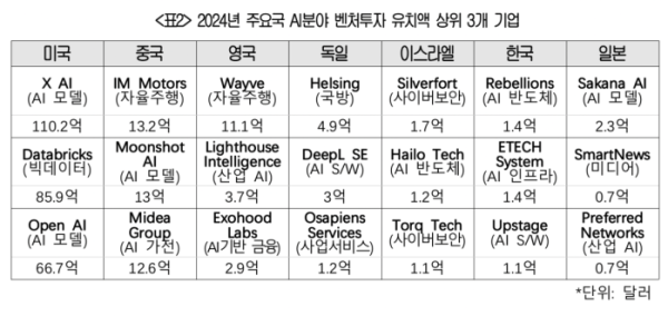 중국 기업 중에서는 자율주행 전기차 기업 IM모터스가 13억2000만 달러, 생성형 AI 기업 문샷AI가 13억 달러를 유치했다. 영국에서는 자율주행 기업 웨이브가 11억1000만 달러를 끌어모았다. 한국 기업 가운데서는 AI 반도체 기업 리벨리온이 1억4000만 달러를 유치했지만, 글로벌 선도 기업과의 격차는 여전히 컸다.