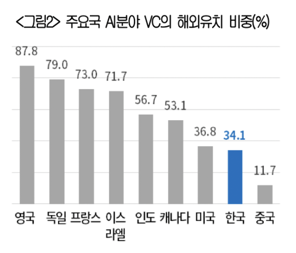 해외 투자 유치 비중을 보면 미국과 중국은 자국 내 자본 비중이 높았던 반면, 영국과 유럽 국가들은 해외 자본 의존도가 컸다. 영국은 전체 투자 유치액의 87%를 해외 벤처캐피털로(VC)부터 조달했으며, 독일(79%), 프랑스(73%)도 해외 투자 비중이 높았다.