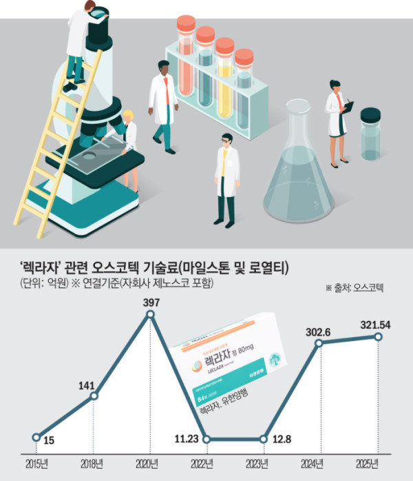 이 계약에 따라 유한양행이 얀센으로부터 수령하는 마일스톤과 판매 로열티 가운데 40%가 오스코텍과 제노스코에 귀속된다. 실제로 오스코텍은 연결기준 렉라자와 관련해 계약금과 단계별 마일스톤, 판매 로열티를 포함해 누적 1200억 원이 넘는 기술료 수입을 확보했다. 기술이전 이후에도 장기간에 걸쳐 현금 흐름이 이어지는 구조를 현실화한 사례로 평가받는다.