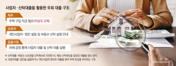 이들은 신탁대출과 사업자대출을 결합해 자금을 조달하는 방식을 택하고 있다. 신탁대출은 부동산 소유권을 신탁회사로 이전한 뒤 신탁재산을 담보로 대출을 받는 구조다. 사업자대출은 법인을 설립하거나 개인사업자 명의로 대출을 받아 주택 잔금을 처리하는 방식이다. 예전부터 사업자대출은 자격 제한이나 자본금, 전문면허 요건이 비교적 느슨해 부동산 대출 규제의 ‘우회로’로 지목돼 왔다.