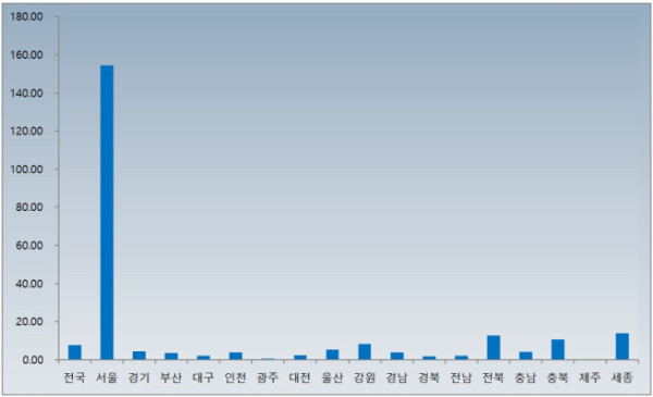 대체로 지난해보다 경쟁률이 떨어졌으나 서울은 98.88대 1에서 154.4대 1로 56.14%나 껑충 뛰었다. 총 16곳이 분양했는데 강동구 '디아테온'(7.69대 1)만 한 자릿수 경쟁률을 보였다. 7곳은 100대 1 이상이었고 90대 1이 넘는 단지도 2곳이다.