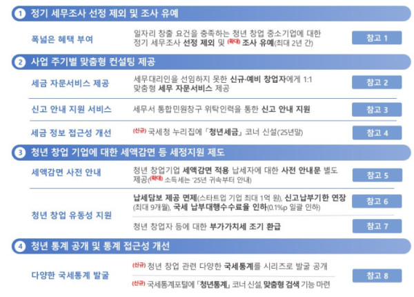 세무 상담 접근성도 높인다. 창업 단계에서는 나눔 세무사·회계사를 통한 1대1 멘토링을 제공하고, 전국 79개 세무서 통합안내창구에서 전자신고와 전자세금계산서 발급 상담을 지원한다. 연말에는 국세청 누리집에 ‘청년세금’ 전용 코너를 신설해 창업 관련 세제와 지원 제도를 한 곳에서 안내할 예정이다.