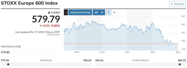 범유럽 주가지수인 스톡스유럽600 지수는 전 거래일 대비 0.01포인트(0.00%) 내린 579.79에 보합 마감했다. 독일 프랑크푸르트증시 DAX30지수는 116.28포인트(0.48%) 하락한 2만3960.59에, 영국 런던증시 FTSE100지수는 89.53포인트(0.92%) 오른 9774.32에, 프랑스 파리증시 CAC40지수는 20.11포인트(0.5%) 떨어진 8086.05에 거래를 마쳤다.