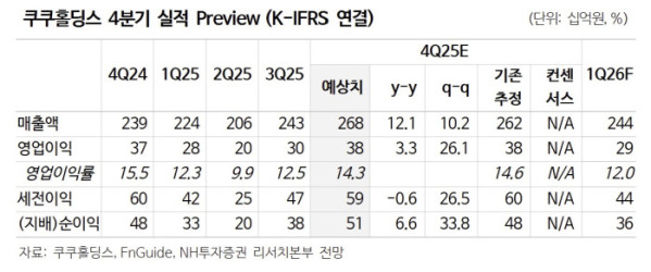 NH투자증권은 18일 쿠쿠홀딩스에 대해 제품 다각화와 해외 매출 확대로 안정적인 실적 성장이 이어지고 있다며 투자의견 ‘매수’를 유지하고 목표주가 4만 원을 유지했다.