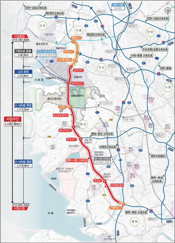 확장 대상은 2013년 개통된 평택~시흥 민자고속도로 중 서평택JCT에서 남안산IC 구간이다. 해당 구간은 현재 왕복 4차로로 운영되고 있으나 교통량 증가로 정체가 잦은 구간으로 꼽혀 왔다. 사업이 완료되면 왕복 6차로에서 최대 8차로까지 확장돼 통행 여건이 크게 개선될 전망이다.
