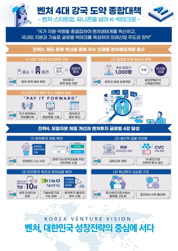 중기부는 2030년까지 AI·딥테크 스타트업 1만 개를 육성할 수 있도록 정부가 확보할 5만 장 규모의 그래픽처리장치(GPU) 중 일부를 벤처·스타트업 연구개발에 배분할 계획이다. 50개의 유니콘·데카콘 육성을 위해 2030년까지 투자 및 보증 방식으로 총 13조5000억 원을 지원한다. 실리콘밸리를 시작으로 도쿄, 싱가포르, 런던, 뉴욕 등 주요 혁신 거점에 스타트업·벤처 캠퍼스를 구축한다.