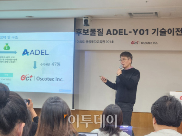 윤태영 오스코텍 대표는 18일 서울 여의도 금융투자교육원에서 열린 ‘ADEL-Y01 기술이전 설명회’에서 사노피와의 계약 배경과 향후 개발 전략을 공개하며 이같이 밝혔다.