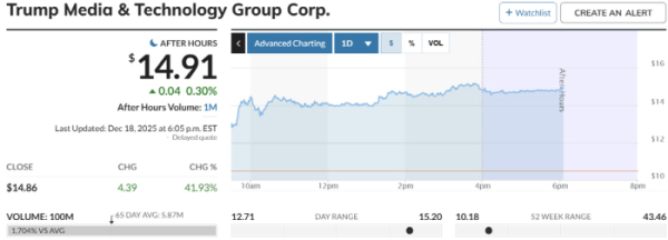 트럼프미디어 주가는 전장보다 41.93% 급등한 14.86달러에 장을 마감했다. 핵융합 에너지를 개발하는 기업 TAE테크놀로지와의 합병을 발표한 것이 주가를 끌어올렸다. 트루스소셜의 모회사인 트럼프미디어는 인공지능(AI) 경쟁이 격화하는 가운데 이번 합병을 통해 원자력 분야로 진출한다고 배런스는 짚었다.