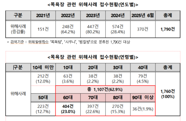 한국소비자원에 따르면 최근 4년 6개월(2021년~2025년 6월) 동안 소비자위해감시시스템(CISS)에 접수된 목욕장 위해(안전사고) 사례는 총 1790건 집계됐다. 연도별로 보면 2021년 151건에서 2022년 248건, 2023년 447건, 작년 574건, 올해 상반기 370건 등으로 연평균 56.1% 증가했다.