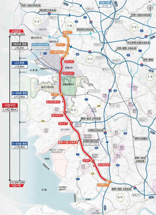 현재 왕복 4차로로 운영 중인 평택-시흥 고속도로는 이번 사업을 통해 6~8차로로 확장된다. 서평택JCT(분기점)에서 마도JCT까지는 6차로로, 마도JCT에서 남안산JCT까지는 8차로로 각각 확장되며 총 공사 기간은 60개월이 소요될 예정이다.