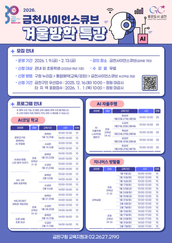 금천구는 금천사이언스큐브에서 내년 1월 9일부터 2월 13일까지 초등학생 530명을 대상으로 AI·과학 특강을 연다.