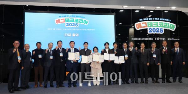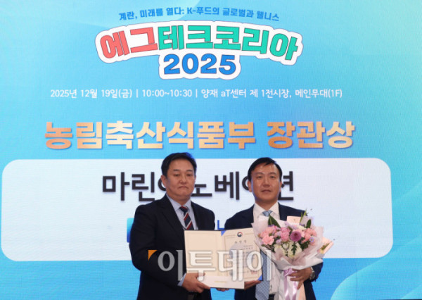 ▲19일 서울 양재 aT센터 제1전시장에서 열린 에그테크코리아 어워드에서 농림축산식품부 장관상을 수상한 차완영(오른쪽) 마린이노베이션 대표가 시상자인 전한영 농림축산식품부 대변인과 기념촬영을 하고 있다. 21일까지 열리는 에그테크 코리아 2025는 '계란·미래·K-푸드·웰니스'를 키워드로 스마트 양계 기술부터 동물복지, 친환경 패키징, 건강한 먹거리까지 계란 산업 전반을 만나볼 수 있다. 고이란 기자 photorean@
