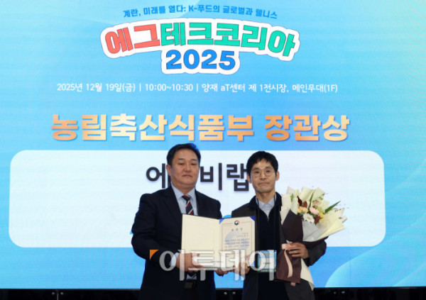▲19일 서울 양재 aT센터 제1전시장에서 열린 에그테크코리아 어워드에서 농림축산식품부 장관상을 수상한 고병수(오른쪽) 에임비랩 대표가 시상자인 전한영 농림축산식품부 대변인과 기념촬영을 하고 있다. 21일까지 열리는 에그테크 코리아 2025는 '계란·미래·K-푸드·웰니스'를 키워드로 스마트 양계 기술부터 동물복지, 친환경 패키징, 건강한 먹거리까지 계란 산업 전반을 만나볼 수 있다. 고이란 기자 photorean@