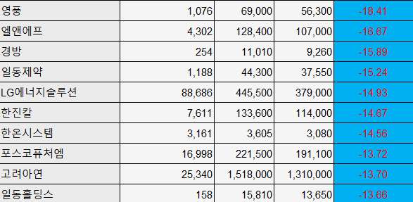 같은 기간 가장 많이 하락한 종목은 영풍으로, 18.41% 내린 5만6300원에 거래를 마쳤다. 다음은 엘앤에프가 -16.67%로 뒤를 이었다.