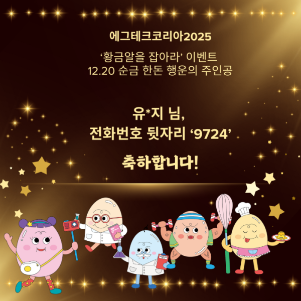 순금 한 돈의 행운을 잡을 수 있는 ‘에그테크코리아 2025’의 ‘황금알을 잡아라’ 둘째 날 행운의 주인공이 나왔다. ‘에그테크코리아 2025’는 19일부터 21일까지 K-푸드의 핵심 식재료이자 무궁무진한 가능성을 가진 계란의 현재와 미래를 조망하는 자리로 마련된 전시 행사다.