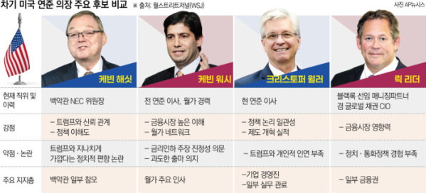 한편 트럼프 대통령은 8년 전 스티븐 므누신 당시 재무장관이 제롬 파월 현 의장을 추천한 것에 대해 지금까지 비판을 멈추지 않고 있다. 이에 스콧 베선트 현 재무장관 등 핵심 참모들은 특정 후보를 공개적으로 지지하는 데 부담을 느끼고 있다고 WSJ는 설명했다. 결과적으로 이런 상황이 연준 의장 지명 과정에서 월가의 영향력을 확대하는 결과로 이어지고 있다는 분석도 나온다.