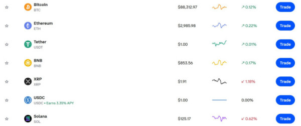 22일(한국시간) 오전 7시 30분 기준 코인베이스 시세에 따르면 비트코인(BTC)은 8만8312달러로 전일 대비 0.12% 상승했다. 이더리움(ETH)도 2985달러로 0.22% 오르며 비교적 견조한 흐름을 보였다. 반면 주요 알트코인은 약세가 두드러졌다. 리플(XRP)은 1.91달러로 1.18% 하락, 솔라나(SOL)는 125달러로 0.62% 하락했다. 바이낸스코인(BNB)은 853달러로 0.17% 상승하며 제한적인 반등에 그쳤다.