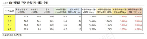 은행지주의 경우 이미 80조~110조 원 규모의 생산적금융 계획을 내놓은 상태다. 이 가운데 국민성장펀드와 자체 투자분을 합친 평균 20조 원 규모 자금에 위험가중치 250%를 적용할 경우, 보통주자본비율(CET1)은 약 28bp 낮아질 수 있다는 분석이다. 포용금융과 관련한 직접 비용 부담은 제한적이지만, 서민금융 출연금 확대 가능성은 상존한다는 평가다.