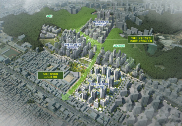 이번 신속통합기획의 핵심은 과거 주택단지 중심 개발로 단절됐던 오패산 녹지축을 미아역(도봉로) 일대까지 확장하고 입체공원과 사업성 보정계수 1.8을 적용해 총 1730가구, 최고 35층 규모의 주거단지를 조성하는 것이다.