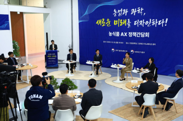 과학기술정보통신부와 농림축산식품부는 22일 충남 천안 연암대학교 스마트팜 연구 현장을 찾아 ‘농식품 기술·산업 AX(AI+X) 촉진을 위한 정책 간담회’를 열고 농업 AI 협력 방안을 논의했다.