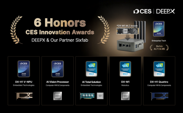 딥엑스는 이번 CES에서 단독부스를 차리고 비디오 인텔리전스 전용 칩셋 ‘DX-H1 V-NPU’를 공개할 예정이다. 해당 제품은 영상 입력·압축·AI 추론 과정을 하나의 카드로 통합함으로써 대규모 영상 AI 인프라의 전력, 비용, 복잡도를 동시에 줄일 수 있다. 이러한 성능을 인정받아 컴퓨팅 하드웨어 및 임베디드 기술 부문에서 ‘CES 2026 혁신상’을 수상했다.