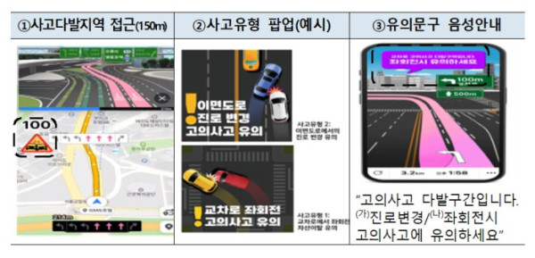 안내 방식도 강화된다. 기존에는 사고다발 지역 진입 직전 15m에서 안내가 이뤄졌으나, 앞으로는 150m 전부터 음성안내가 시작된다. 또 해당 구간에서 빈번하게 발생하는 사고 유형인 진로변경, 좌회전 고의사고 등에 대해 팝업 안내를 추가해 운전자의 경각심을 높인다.