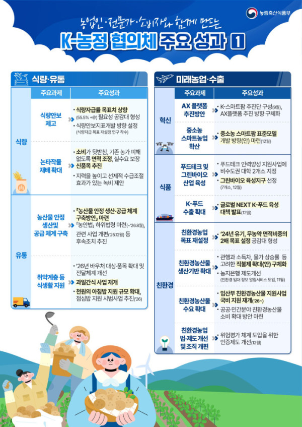 농림축산식품부는 22일 충북 청주 오스코에서 ‘함께 만드는 K-농정협의체’ 성과보고회를 열고, 8월 출범 이후 협의체 논의를 통해 도출한 주요 정책 성과를 공개했다.