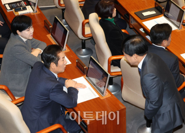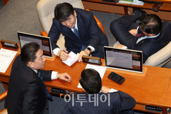 ▲22일 서울 여의도 국회 본회의에서 김병기(왼쪽) 더불어민주당 원내대표와 문진석(왼쪽 두번째) 원내운영수석부대표가 의원들과 대화하고 있다. 고이란 기자 photoeran@