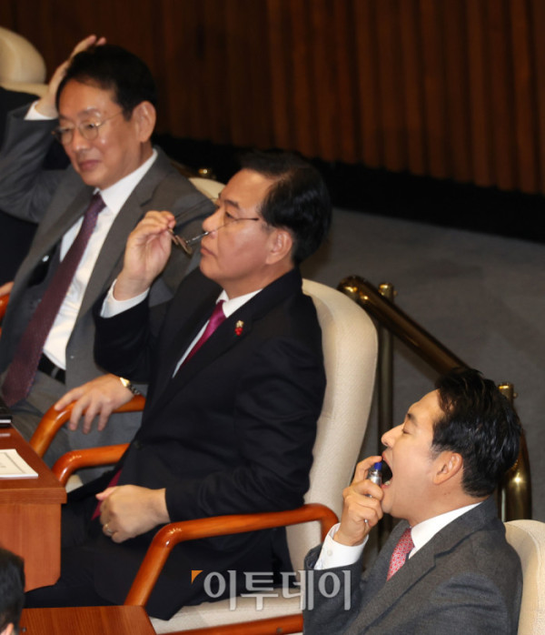 ▲22일 서울 여의도 국회 본회의에 장동혁(오른쪽부터) 국민의힘 대표, 송언석 원내대표, 김도읍 의원이 참석하고 있다. 고이란 기자 photoeran@