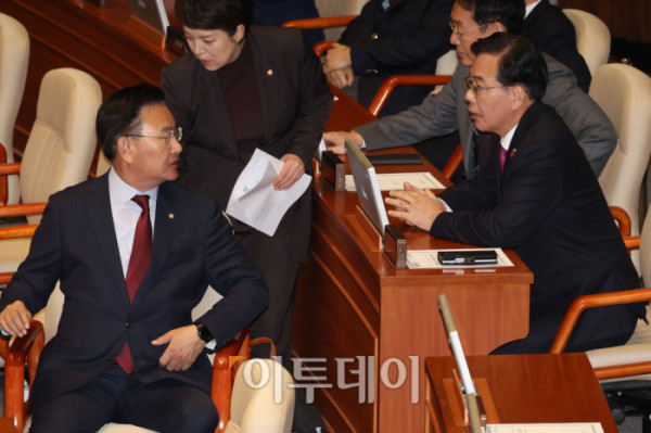 ▲22일 서울 여의도 국회 본회의에서 송언석(오른쪽) 국민의힘 원내대표와 유상범 원내운영수석부대표가 대화하고 있다. 고이란 기자 photoeran@