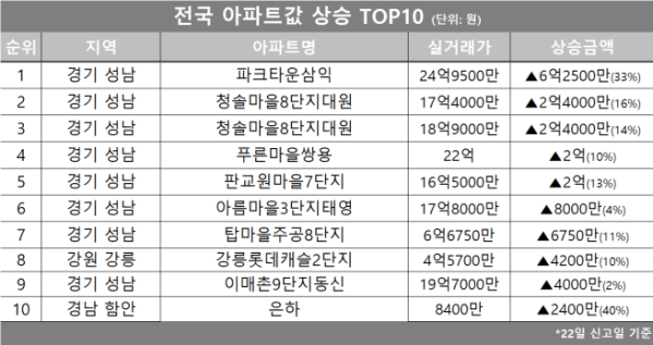 이어 경기 성남시 ‘푸른마을쌍용’이 22억 원에 거래되며 10% 올라 4위를 기록했고 ‘판교원마을7단지’는 16억5000만 원에 거래되며 13% 상승해 5위에 올랐다.