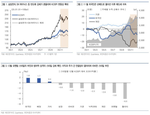 산타랠리가 요원한 국내 증시는 금리 변수와 인공지능(AI) 밸류에이션 부담이 맞물리며 높은 변동성이 이어지고 있다는 진단이 나왔다. 다만 내년 1월 4분기 실적시즌이 시작되면 이익과 주가의 연결성이 다시 짙어지면서, 최근 주가 부진으로 밸류에이션 부담이 낮아진 종목이 재조명될 수 있다는 전망이 제시됐다.