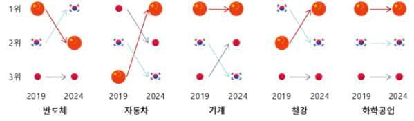 ▲한·중·일 5대 주력 품목별 수출경쟁력 종합순위 변화 (출처=한국무역협회)