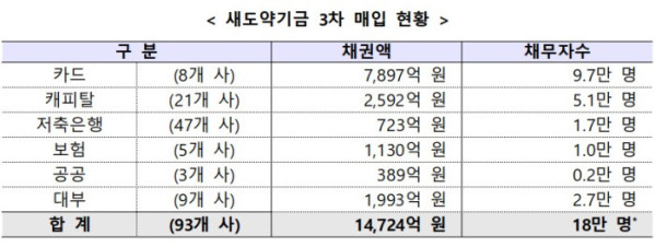 새도약기금이 카드사와 캐피탈, 저축은행 등이 보유한 장기 연체채권 1조4724억 원을 매입했다.