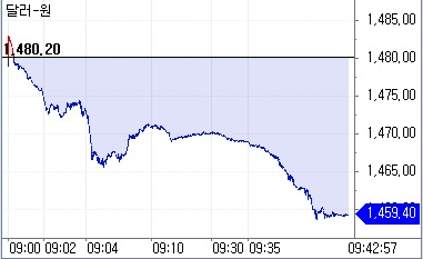 24일 오전 9시42분 현재 서울 외환시장에서 원·달러 환율은 전일대비 24.2원(1.63%) 급락한 1459.4원을 기록 중이다. 장중 한때 25원 넘게 급락하며 1458.0원까지 떨어지기도 했었다.